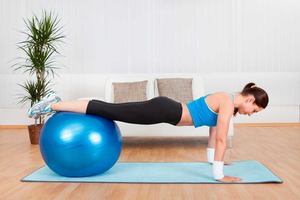 - Поставить голени ног на мяч и отжаться от пола пять раз с широко расставлеными ладонями и пять раз — с ладонями на ширину плеч.