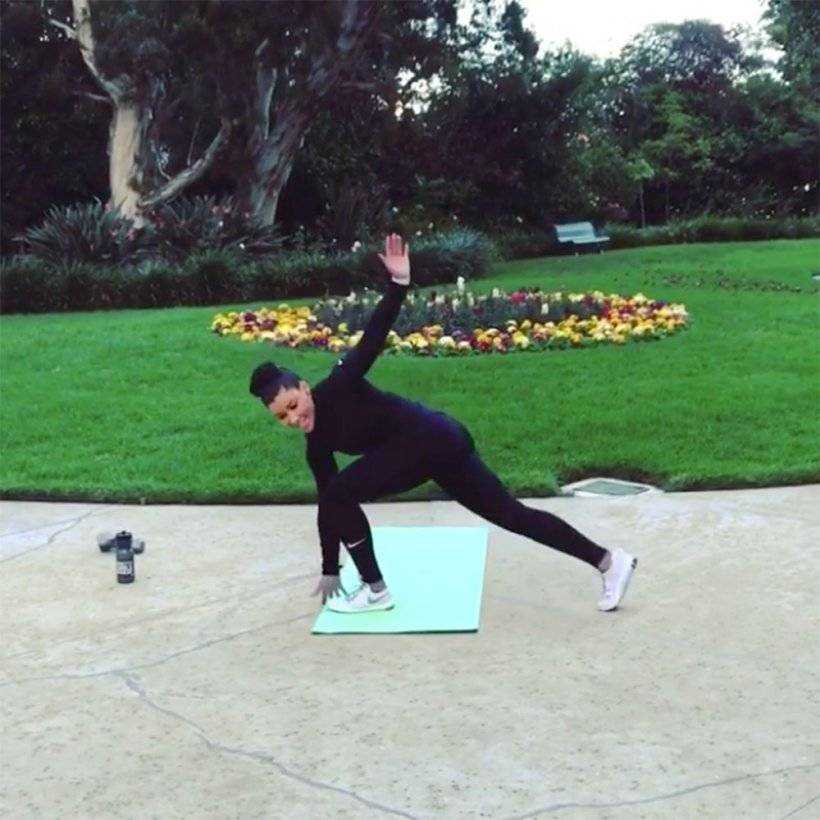 Приседания со штангой – хорошее упражнение для ног и ягодиц. Штангу держат за спиной и глубоко приседают 8-10 раз; Выпады с гантелями, 10-15 раз на каждую ногу; Жим штанги лежа (10 раз); Отжимания (с небольшим грузом по 10 раз). Как видно, упражнения разнообразны, в работу включены все группы мышц. Для достижения наилучшего результата звезда советует правильно питаться, пить свежевыжатые соки и как можно больше ходить пешком. Сама певица помимо этой тренировки, занимается боксом и пилатесом, в летнее время увлекается серфингом.