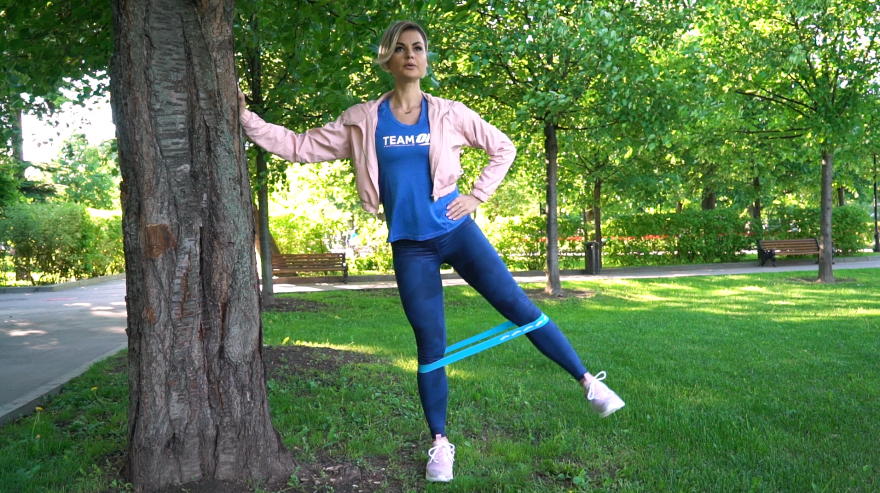 - Прорабатываем внутреннюю и внешнюю поверхности бёдер. Выполняем в положении стоя. Начинающие могут держаться одной рукой за опору. Надеваем петлю или гимнастическую эластичную ленту на область щиколоток. Отводим ногу в сторону и вверх, максимально натягивая резинку. Для каждой ноги выполняют по 10−12 движений в 2−3 подхода.
