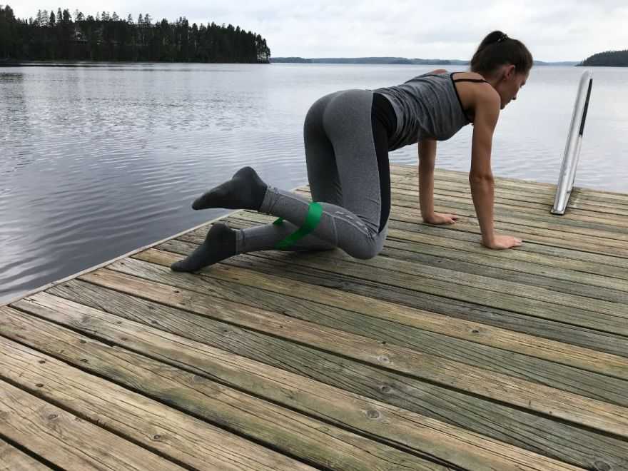 - Тяга резинки для спины. Встаем на колени, левую ногу выставляем вперед, ленту цепляем за ступню. Другой конец мини-бэнда зажимаем в правой руке. Тянем резинку назад, сгибая локоть и разворачивая корпус боком, чтобы появилась нагрузка на мышцы спины. Выполняем несколько заходов, затем ногу и руку меняем.